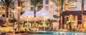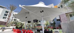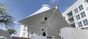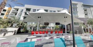 Tension fabric structure at the lounge pool area perfectly complements modern architecture of the apartment complex. design date: 2014 material: structural steel and PVC fabric