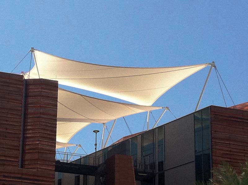 With stone, glass and fabric the architect of this building has created a memorable building. The dramatic sails provide shade and temperature control over the building center core. design date: 2010 material: PTFE